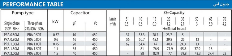 این موتور با قدرت 0.5 اسب بخار کار میکند. قسمت تحریک این موتور به کمک یک خازن توکار عمل میکند هم چنین ولتاژ موتور 220 ولت میباشد و برای ساخت پوسته و پایهی موتور از آلومینیوم استفاده میکنند.سایز دهانه ورودی PRA 0.50M برابر 1 اینچ و سایز دهانه خروجی آن 1 اینچ است و مناسب ساختمان های مسکونی 2 طبقه با 1 تا 2 واحد است. لازم به ذکر است برای اتصال این پمپ بهتر است از سیستم برقرسانی مجزا استفاده کنید؛ زیرا توان مصرفی آن به گونهای است که اگر با دستگاههای الکتریکی دیگر مشترک باشد، ممکن است به این وسایل آسیب وارد شود و رعایت این موضوع در عمر مفید الکتروپمپ تاثیر مثبت دارد.